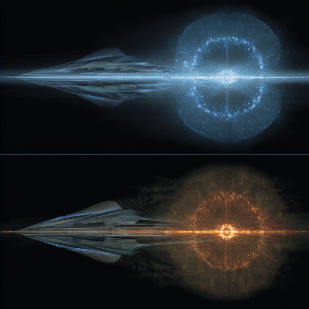 By maintaining balanced feedback, the device creates a moving coherence band that “pulls” the craft forward by locally aligning spacetime curvature with the direction of travel. No mass is ejected; the propulsion emerges from the protected alignment itself.