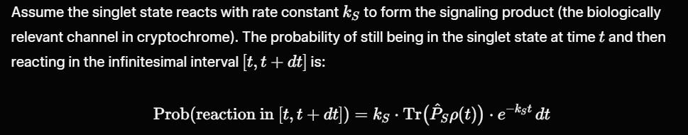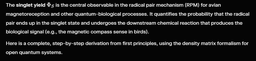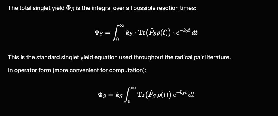 The singlet yield ΦS \Phi_S ΦS is the central observable in the radical pair mechanism (RPM) for avian magnetoreception and other quantum-biological processes. It quantifies the probability that the radical pair ends up in the singlet state and undergoes the downstream chemical reaction that produces the biological signal (e.g., the magnetic compass sense in birds).
