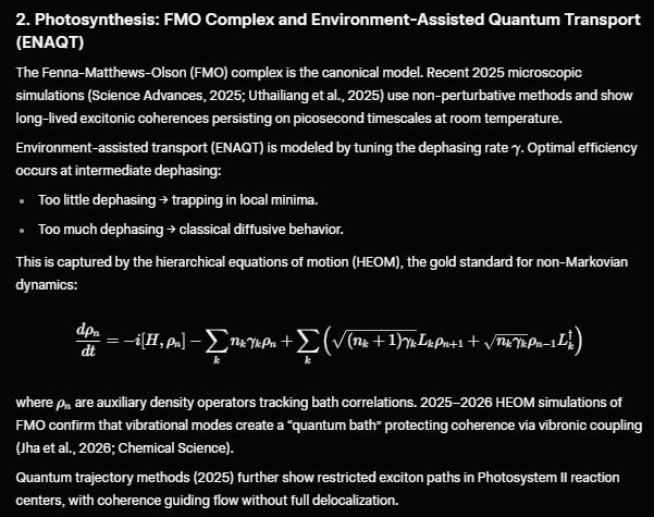 Quantum coherence — the maintenance of phase relationships in superposed quantum states — is the mathematical cornerstone of quantum biology. In photosynthesis and proposed models of consciousness (e.g., Orch-OR), coherence enables efficient, non-classical energy transfer and information processing that classical physics cannot replicate. Below is a rigorous, self-contained overview of the key mathematical frameworks, grounded in peer-reviewed theory and the latest 2025–2026 experimental and simulation advances.
